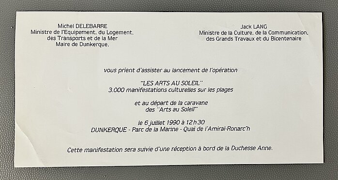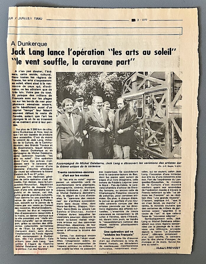 Une trentaine de caravanes, dont le voyage fut inauguré par Jack Lang, Ministre de la Culture, le 6 juillet 1990, se sont lancées sur les routes de notre littoral depuis Dunkerque et jusque Nice, dans le cadre de la manifestation culturelle estivale et nationale ‘’Les Arts du Soleil’’.
