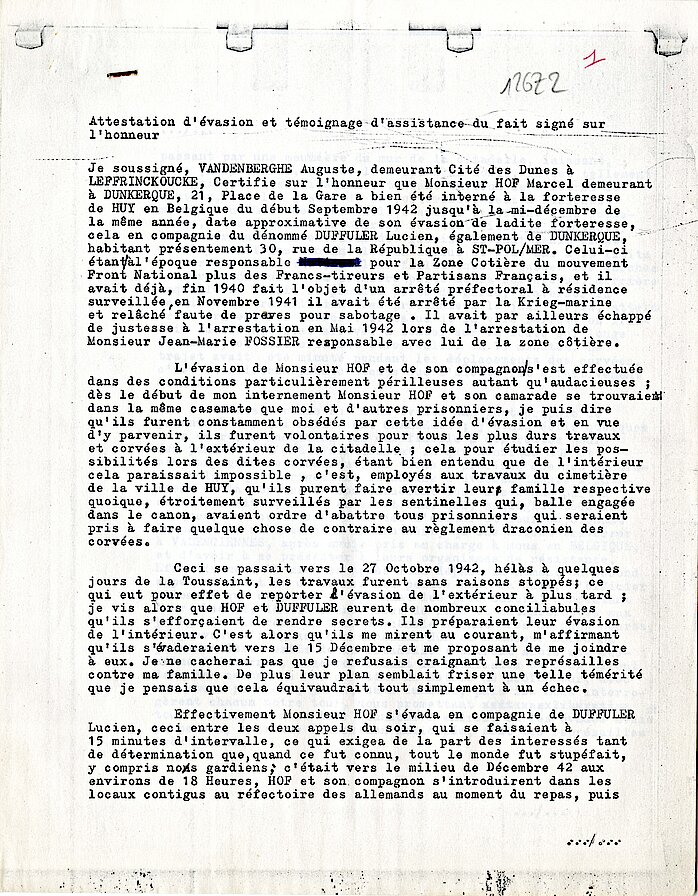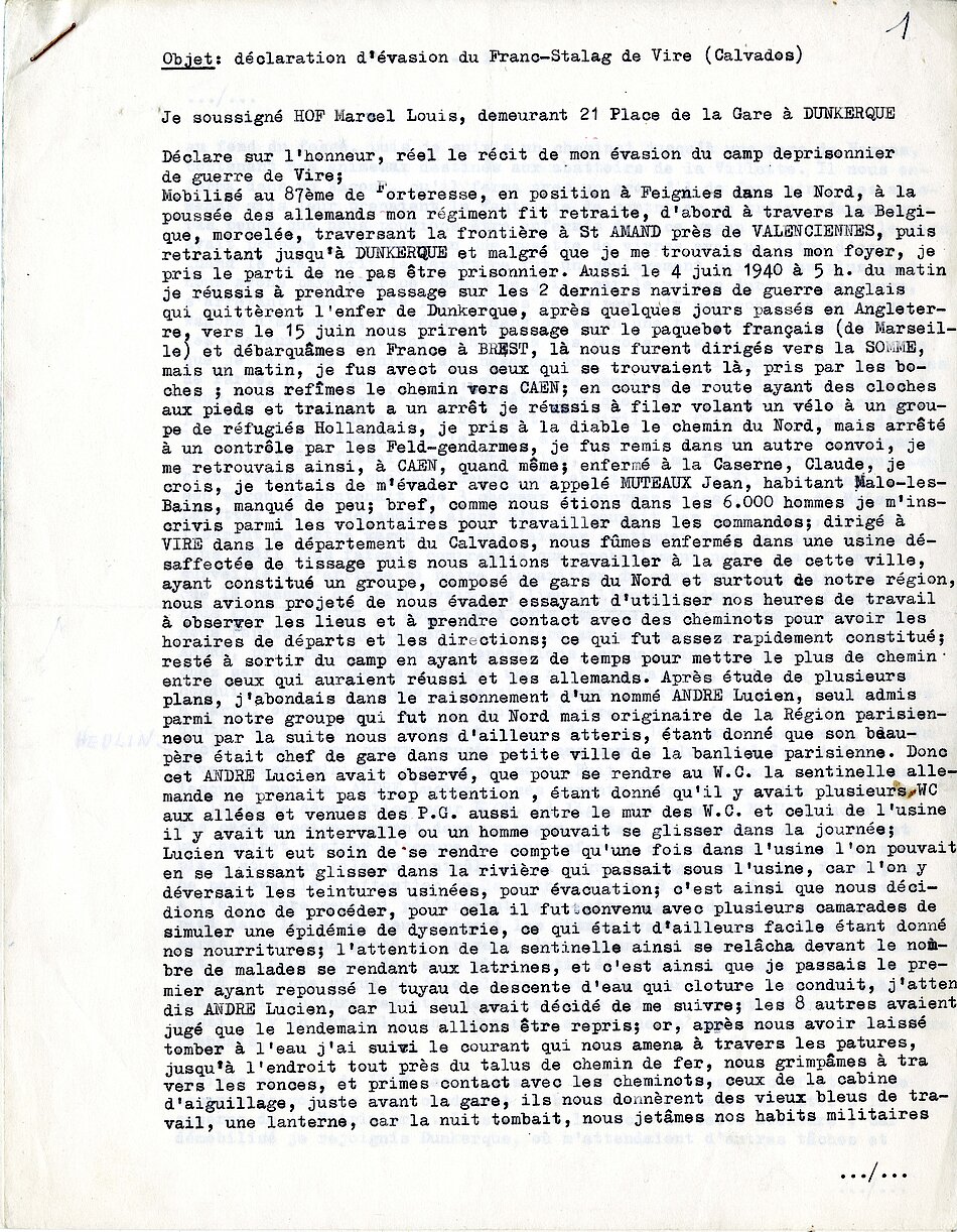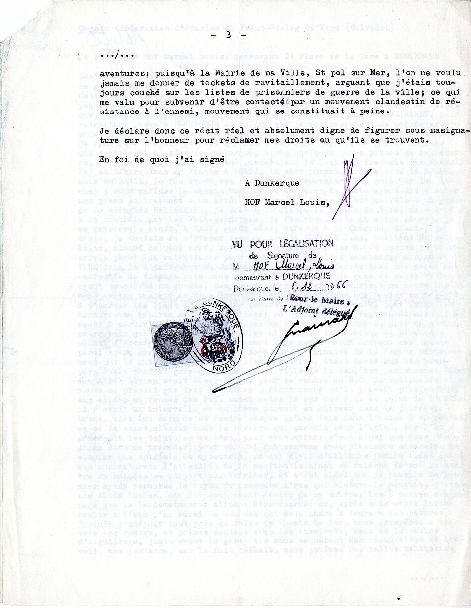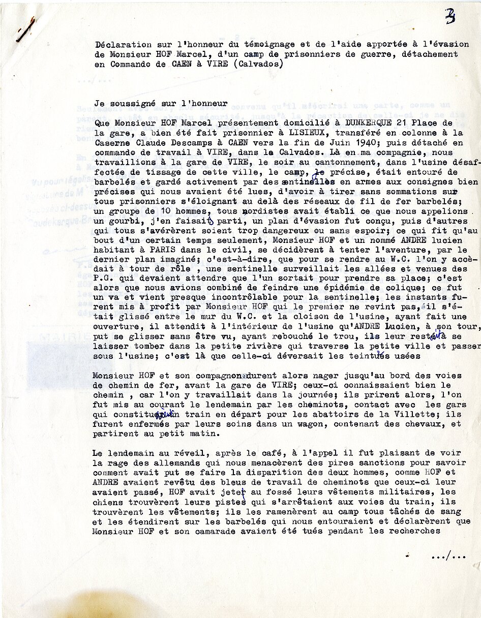 Déclarations sur l’honneur de témoignages sur l’évasion de Monsieur Marcel Hof du camp de prisonniers de guerre à Vire, 126Z2