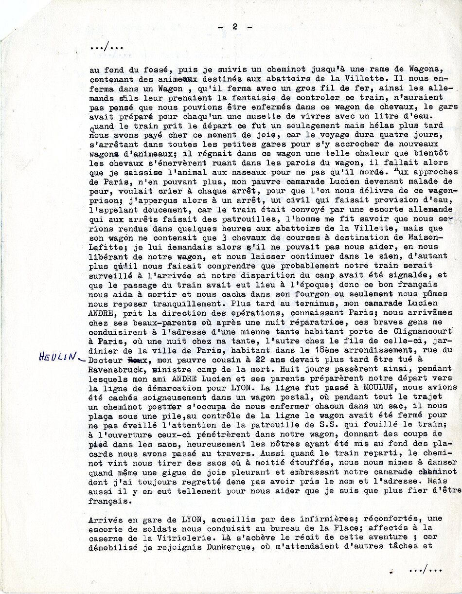 S’ensuit sa première évasion en compagnie d’André Lucien, en passant par des sanitaires et en embarquant dans des wagons à bestiaux jusque Paris, puis Lyon pour y être démobilisé.